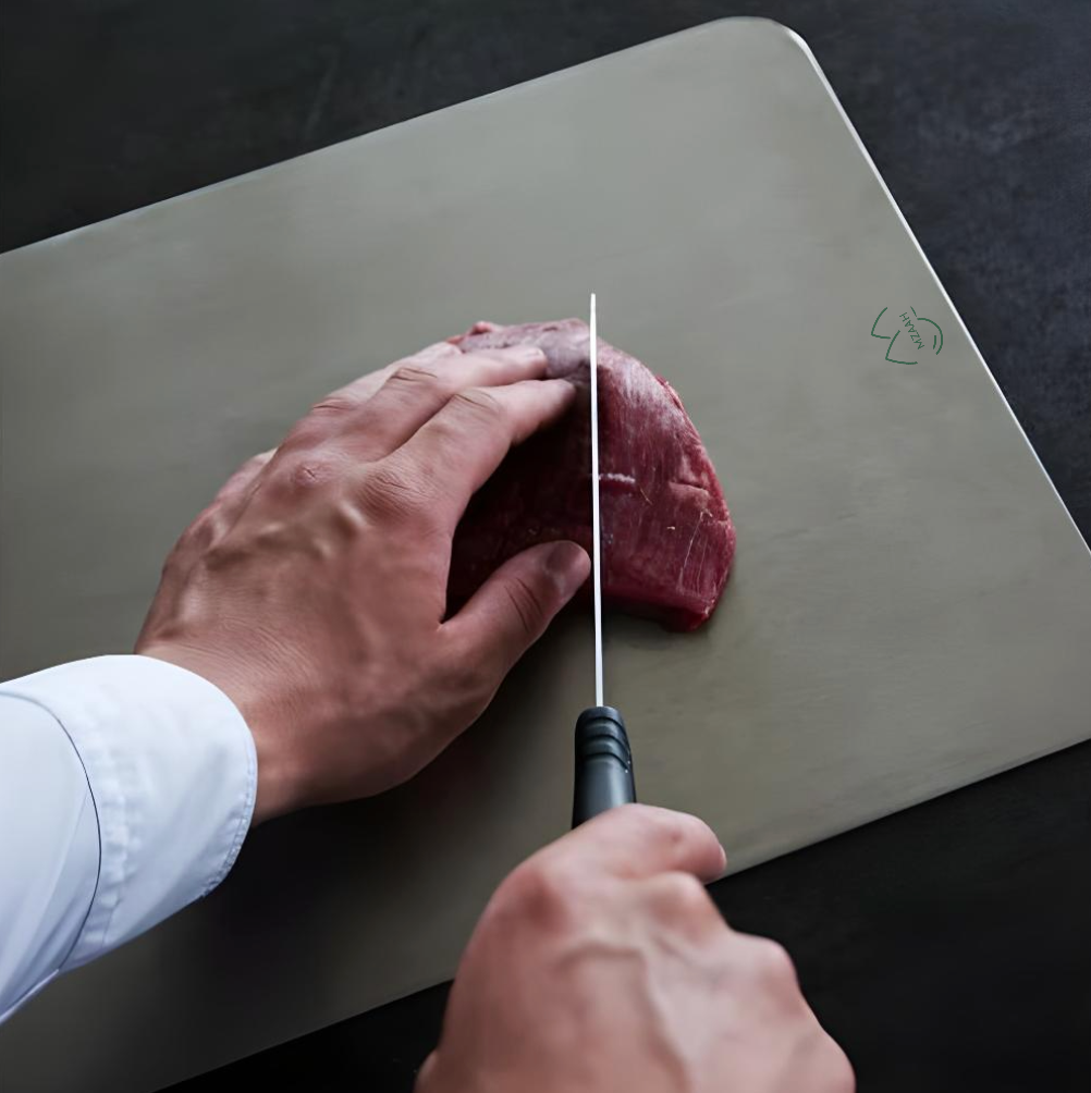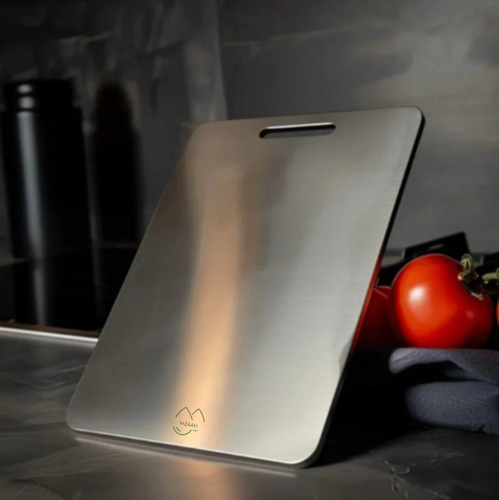 The MZAAH Premium Stainless Steel Cutting Board is a practical and modern kitchen essential designed for everyday food preparation. Made from high-quality stainless steel, it offers a durable, non-porous surface that resists stains and odors from regular use. Its clean, minimalist design fits well in any kitchen while providing a reliable workspace for preparing meats, vegetables, fruits, and more.