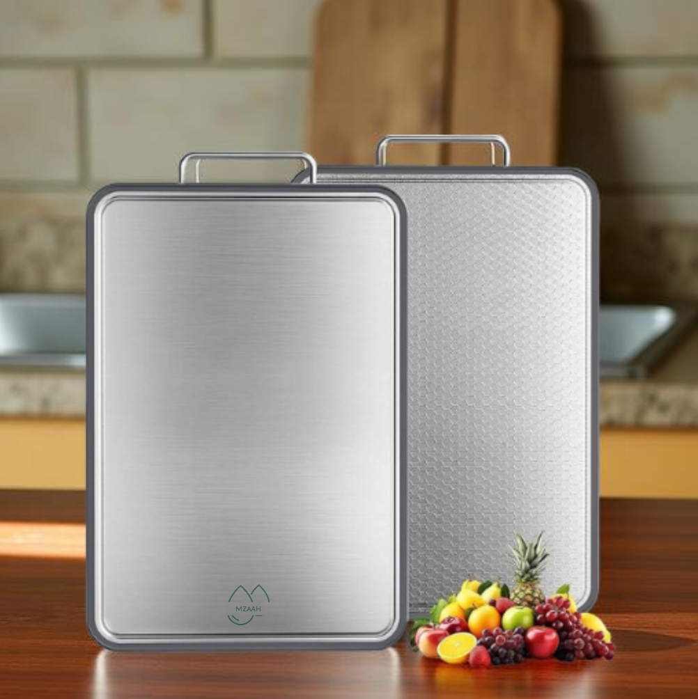 The MZAAH double-sided stainless steel cutting board is designed for practical, everyday food preparation with a focus on durability, hygiene, and ease of use. Made entirely from high-quality stainless steel, it provides a strong, non-porous surface suitable for a wide range of kitchen tasks.